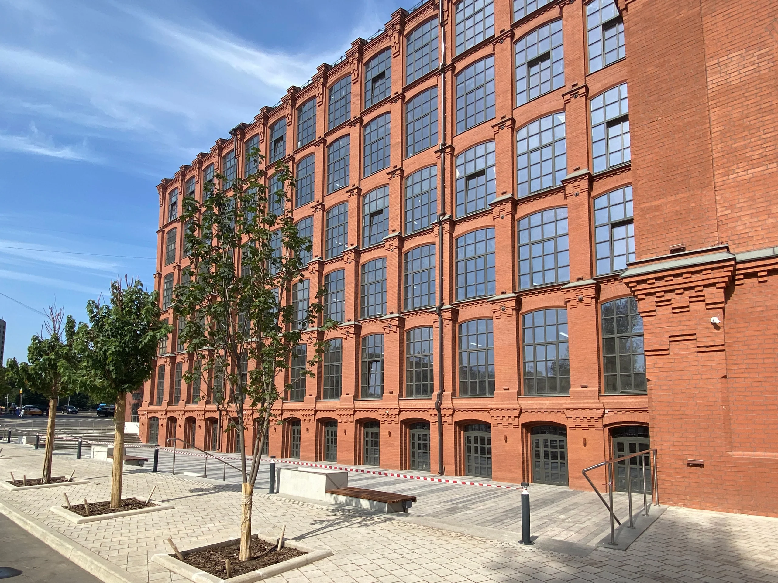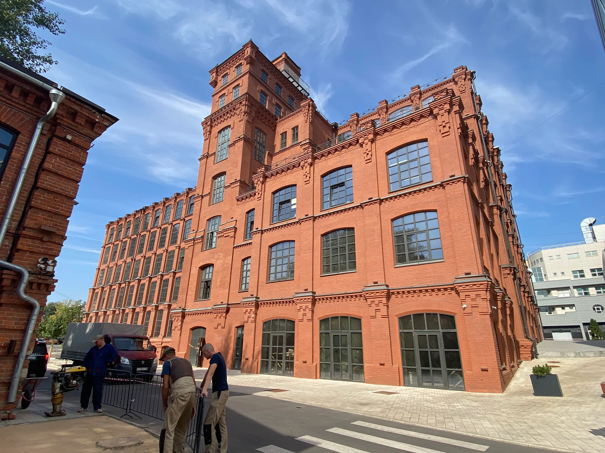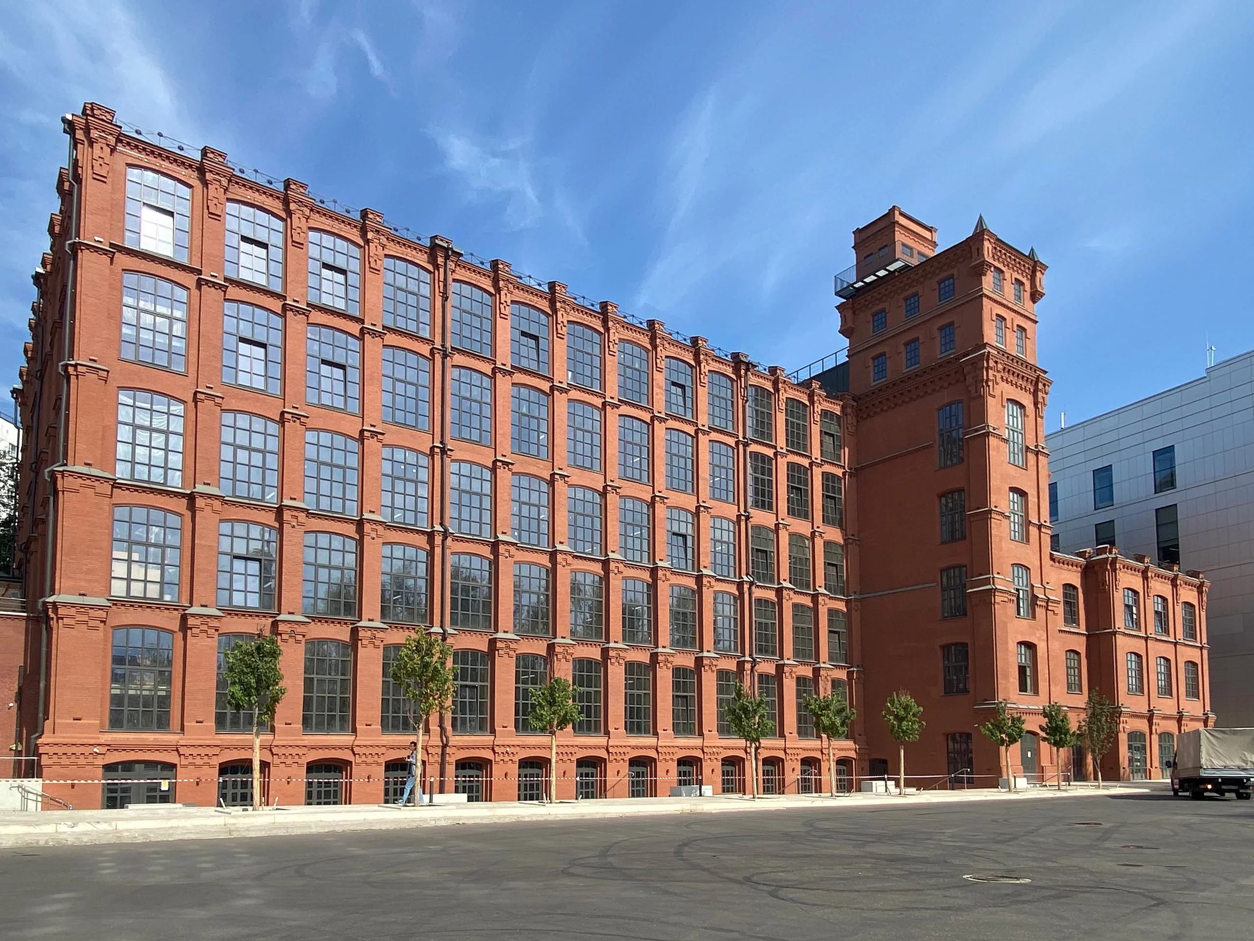 Пятиэтажное с подвалом кирпичное прямоугольное в плане здание строения 5 прядильного корпуса расположено по красной линии улицы Рочдельская и состоит из двух корпусов с лестничной башней, стоящей на стыке двух основных объемов. Здание было выстроено в 1897г. арх. А. Н. Милюковым. Фасады здания решены в формах эклектики кон. XIX в. в «кирпичном стиле», характерном для промышленной архитектуры 1890-х годов, ритмически расчленены вертикальными плоскими лопатками по всей высоте здания с